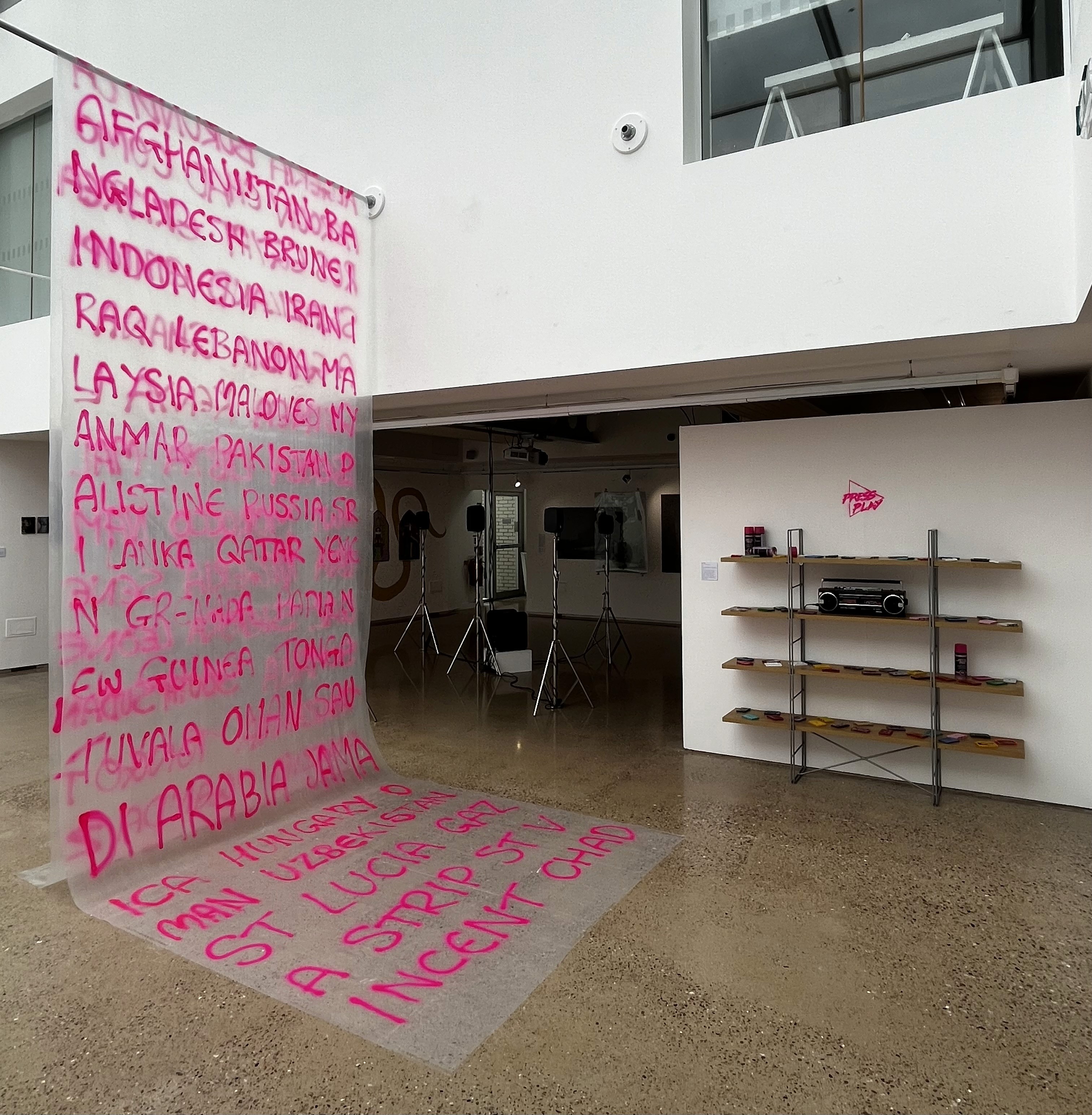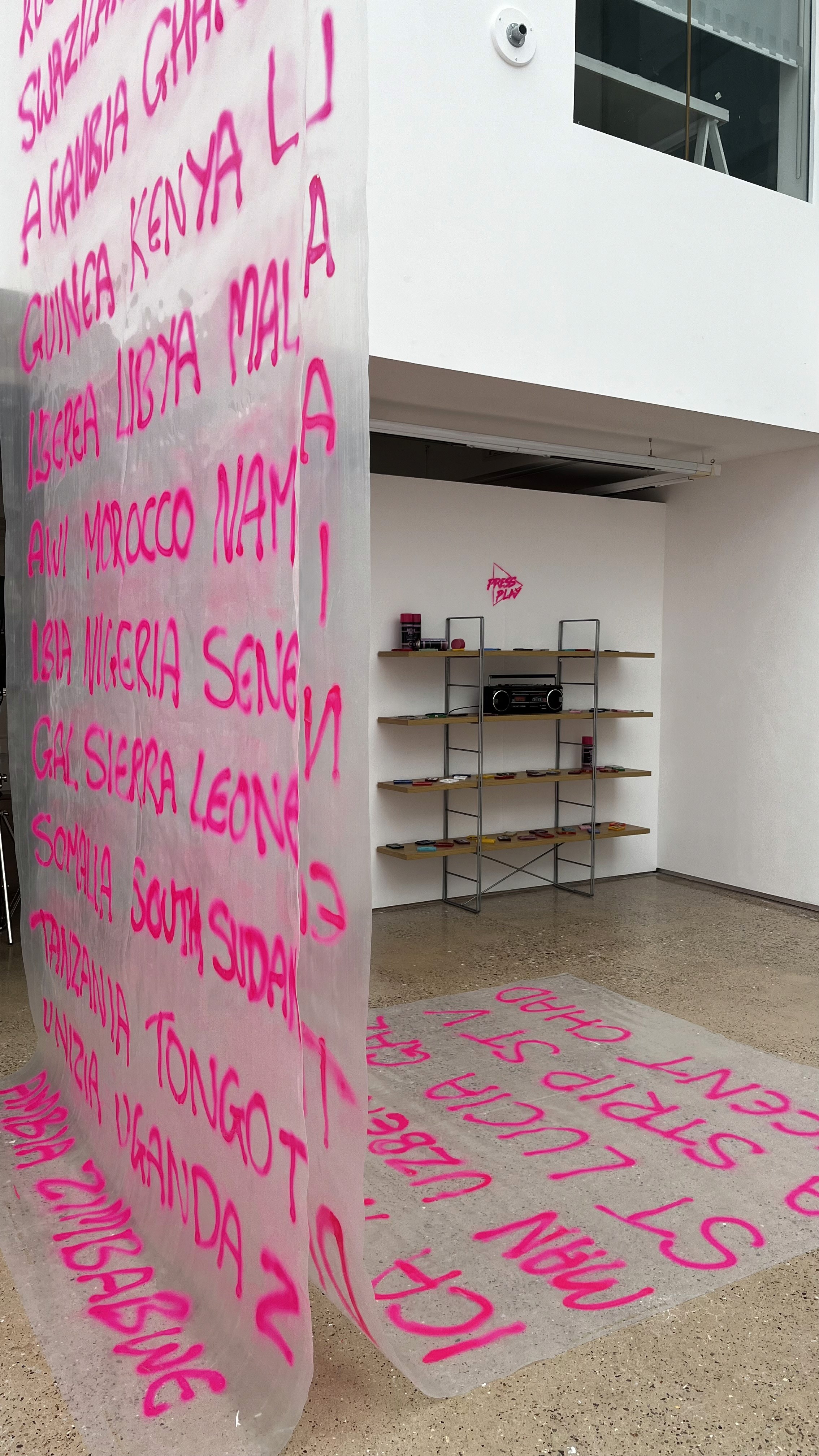 This installation aims to bring attention to this issue by highlighting the 68 countries involved for all to see. Adjacent to the polythene sheet is a shelf displaying cassettes: each representing one of these countries. Each cassette features a speech addressing LGBT+ rights, accompanied by translations of the speech into multiple languages - a nod to censorship.