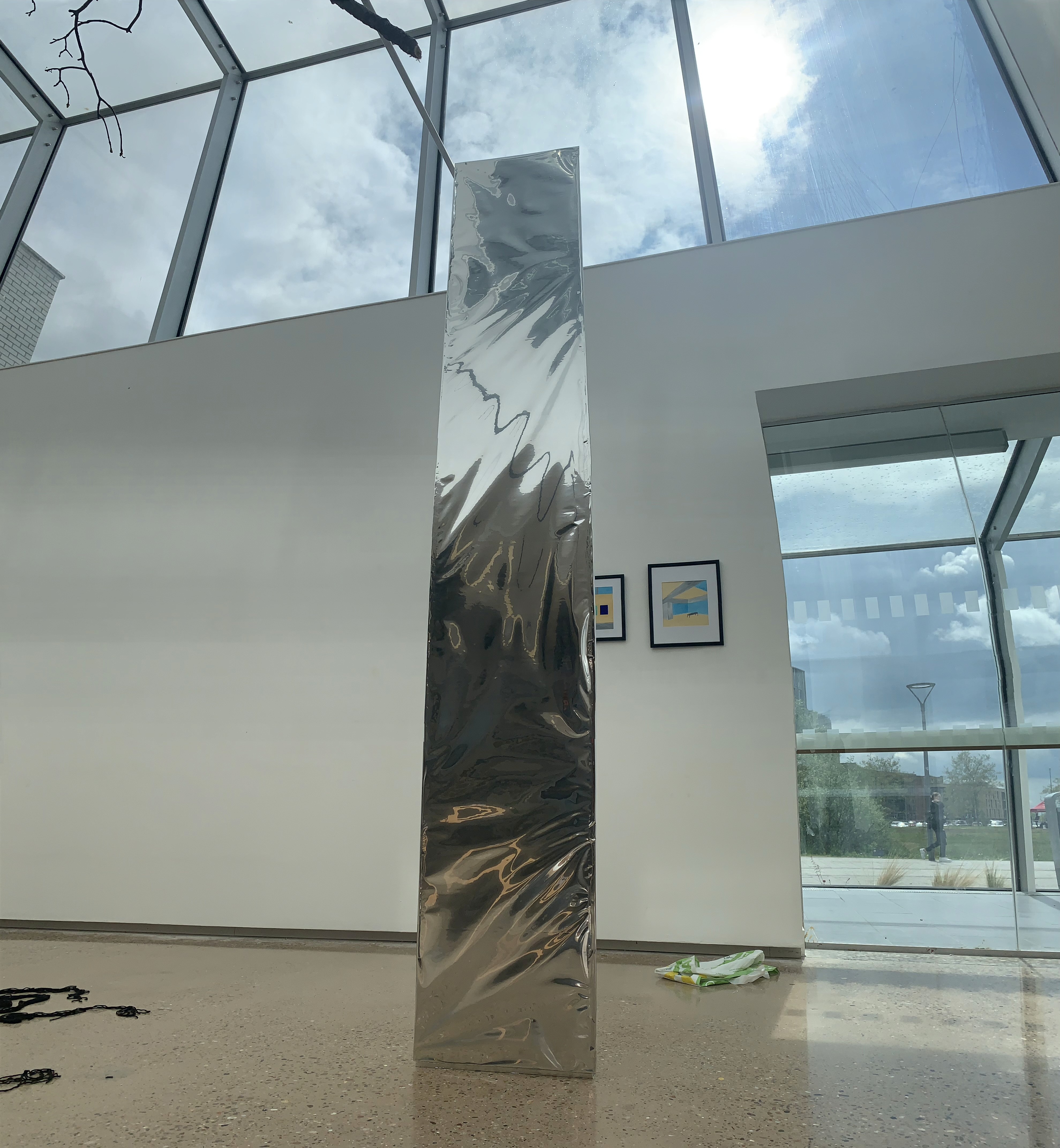 This piece looked at the simplicity of artists spaces and the architectural forms that make up modern art galleries. The monolith also provided an imperfect mirror for individuals to evaluate the work around them as well as their own reflections. Placed thoughtfully in a triad of sculptures, the chance to collaborate with other individuals on my degree was extraordinary and having the chance to listen to their ideas to then helping each other implement them in a gallery setting for the first time will always be one of my most cherished memories from throughout my studies.