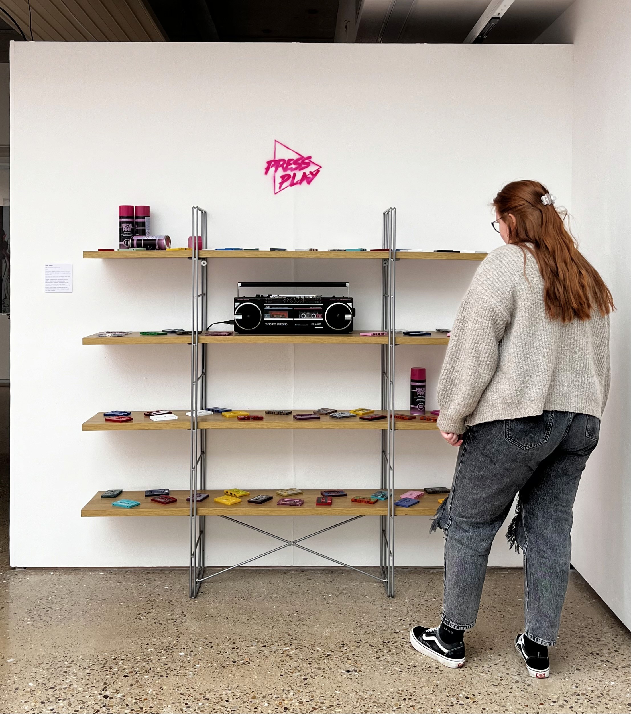 A 10m long graffitied polythene sheet, paired with a vintage Ikea Enetri shelving unit; holding 68 recorded cassettes.