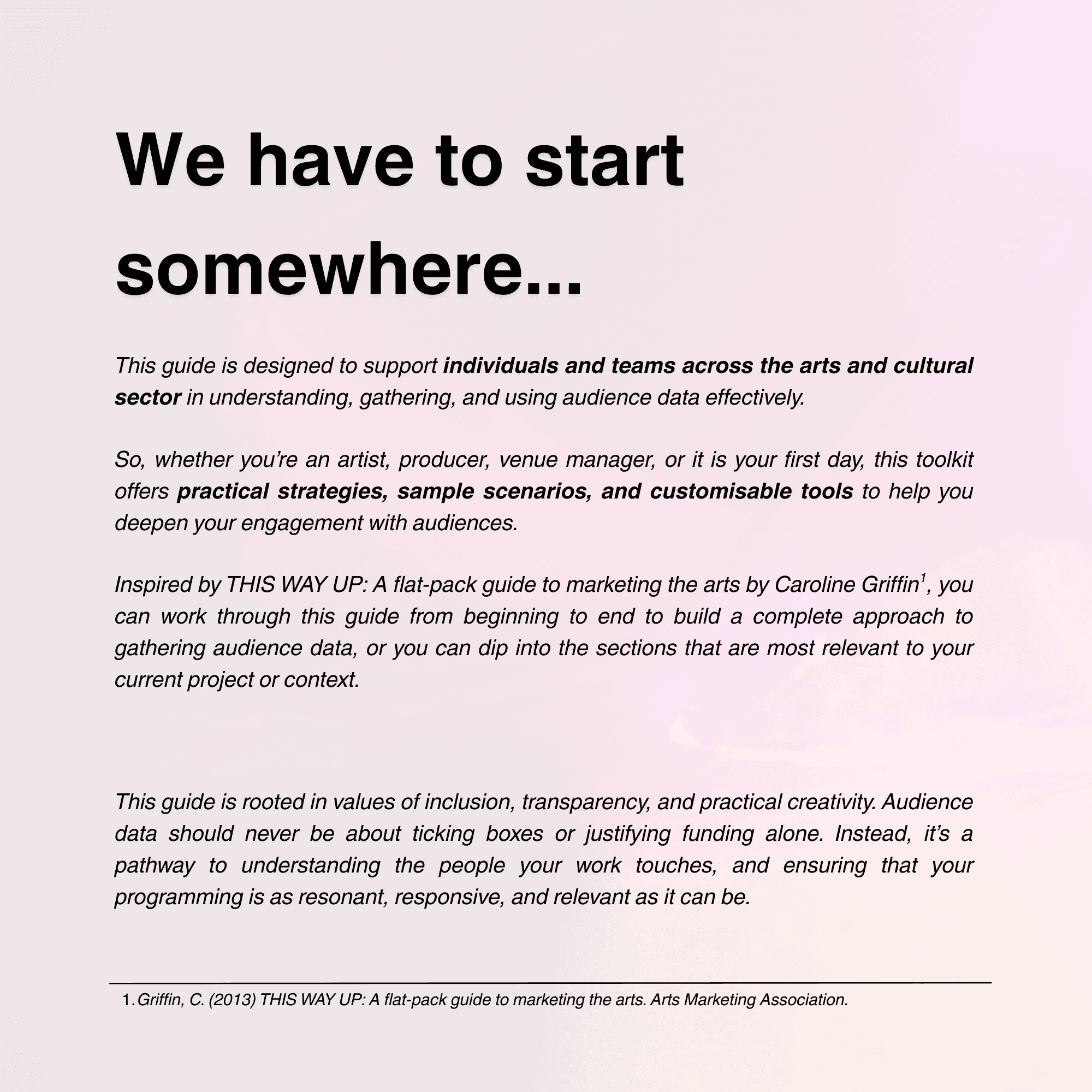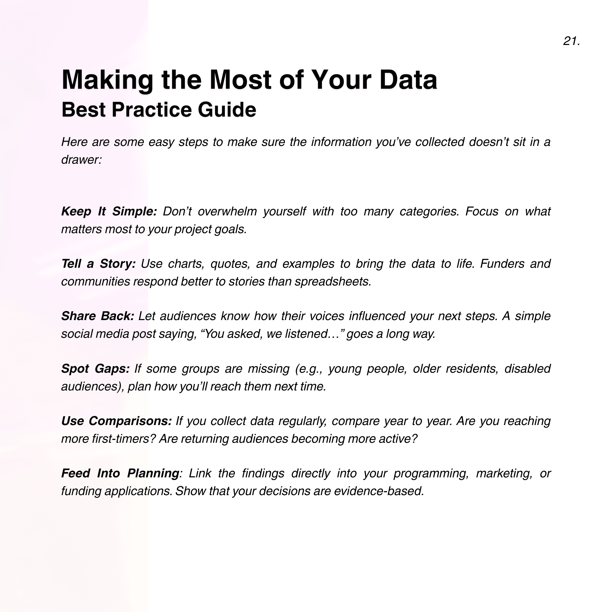 The guide is designed to help arts and cultural organisations better understand, collect, and use audience data, serving as an introduction for those starting their creative careers and as a reference for practitioners looking to refresh their methods or explore new strategies. It takes a practical approach to capacity building within arts organisations and offers simple worksheets for individuals to follow and work within.